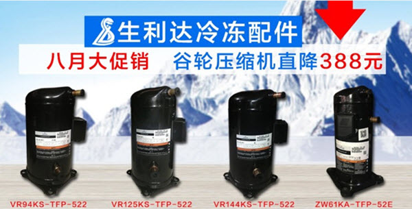 生利达制冷将拿出VR94KS-TFP-522、VR125KS-TFP-522、VR144KS-TFP-522、ZW61KA-TFP-52E等谷轮涡旋压缩机让利给到广大客户,并且期间:
